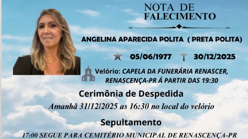 A Empresa Funerária Saudades & Renascer de Renascença comunicam com pesar o falecimento de Paulo Cesar Strada (Popularmente Conhecido como Balão), aos 46 Anos, ocorrido Hoje Vítima de Acidente em General Carneiro - PR. Seu corpo será velado na Capela da Funerária (Sem previsão de início), Celebração de Éxequias e Sepultamento ainda será definido por seus Familiares. Aos Familiares e Amigos nossos sinceros sentimentos!