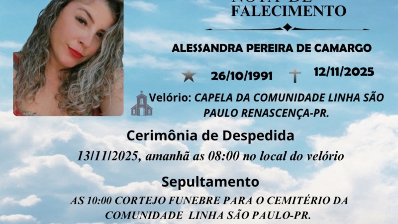 A Empresa Funerária Renascer, comunica com pesar o falecimento de ZENAIDE ZANDONA BEDIN, aos 95 anos, ocorrido hoje (13/07) em sua residência. Seu corpo será velado na Capela da Funerária Renascer em Renascença-PR. Missa de Exéquias ocorrerá hoje (13/07) as 16:00 e as 17:30 seguirá o cortejo fúnebre para o Cemitério Municipal de Renascença-PR. Aos familiares e amigos nosso sinceros sentimentos!