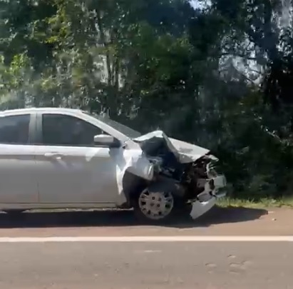Com o impacto da colisão, a roda de um dos automóveis se desprendeu. Equipes do SAMU, Corpo de Bombeiros e EPR estão no local realizando o atendimento.