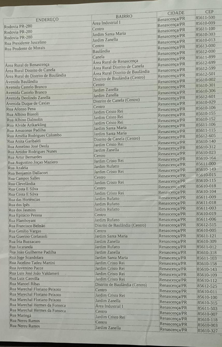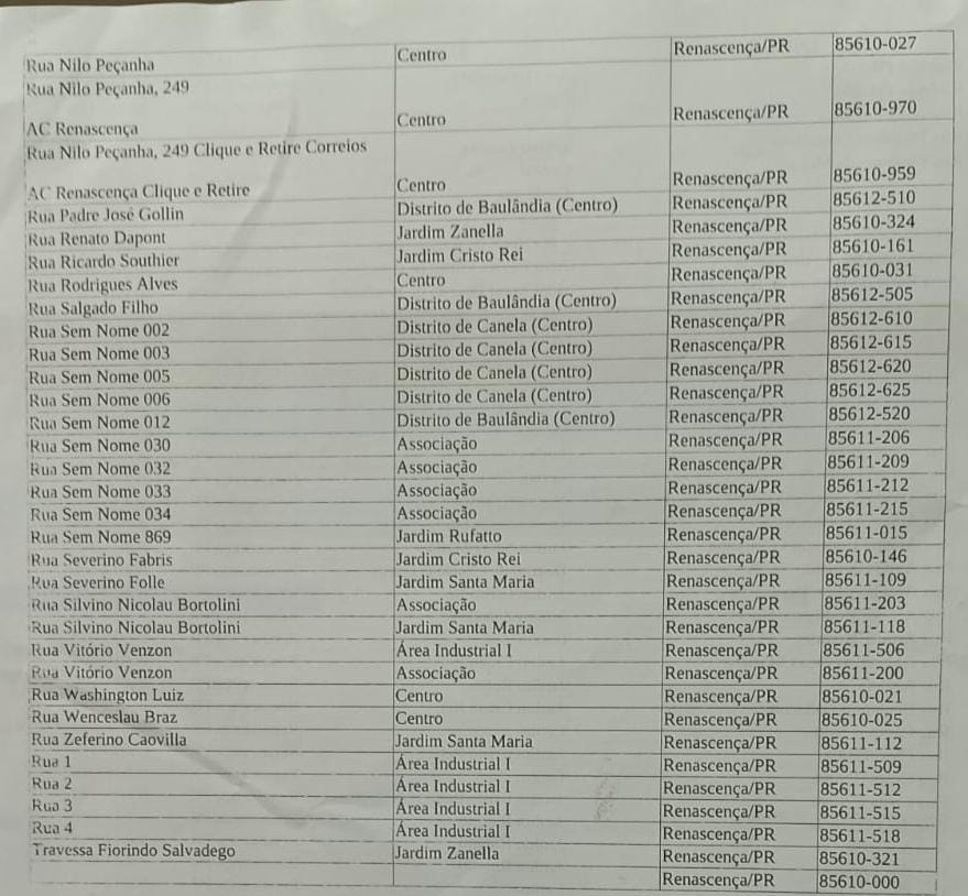 Recentemente, o CEEP da cidade de Renascença passou por mudanças. O número 85610-000 não é mais válido para toda a cidade — agora cada rua, avenida, área industrial e rural possui um CEP específico.