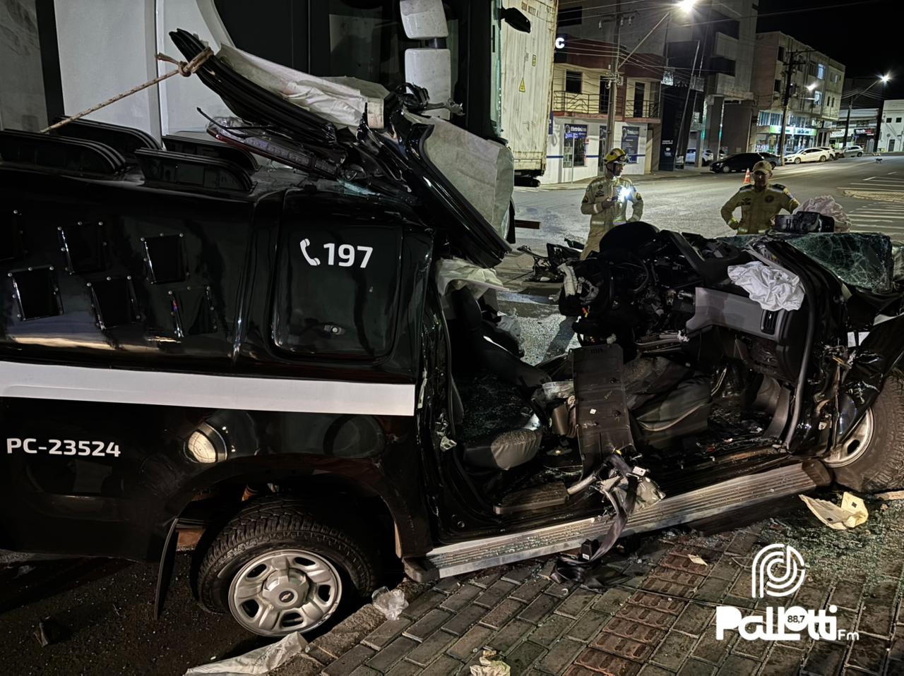 Com o impacto, a viatura foi arrastada por vários metros e acabou prensada contra o meio-fio, em frente a um prédio comercial que teve uma das portas de vidro estilhaçada.