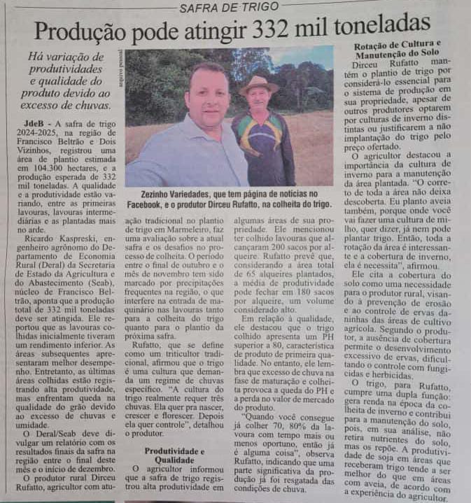 O Portal de Comunicação Zezinho Variedades — Web Rádio, Site e Redes Sociais — vem, por meio desta, agradecer ao Jornal de Beltrão pela parceria e colaboração na matéria produzida recentemente sobre a produção de trigo em nossa região.