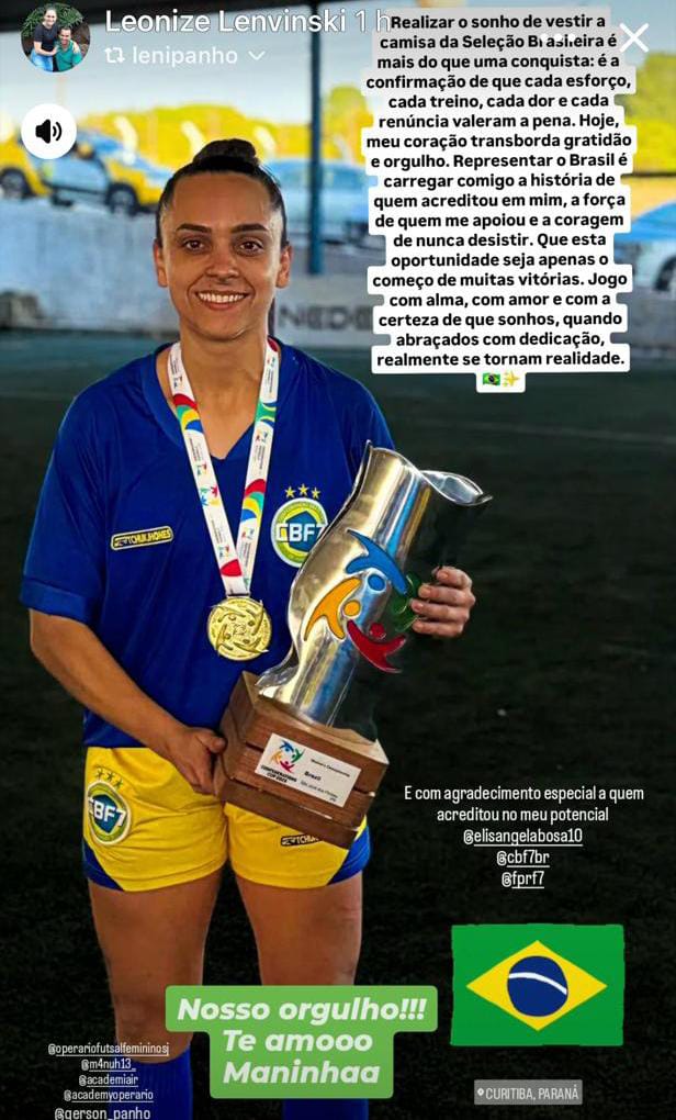 A convocação para a Seleção Brasileira ocorreu durante o Campeonato Brasileiro de Futebol Sete, disputado entre os dias 20 e 23 de novembro, em São José dos Pinhais. Para Leni, o momento foi inesquecível.