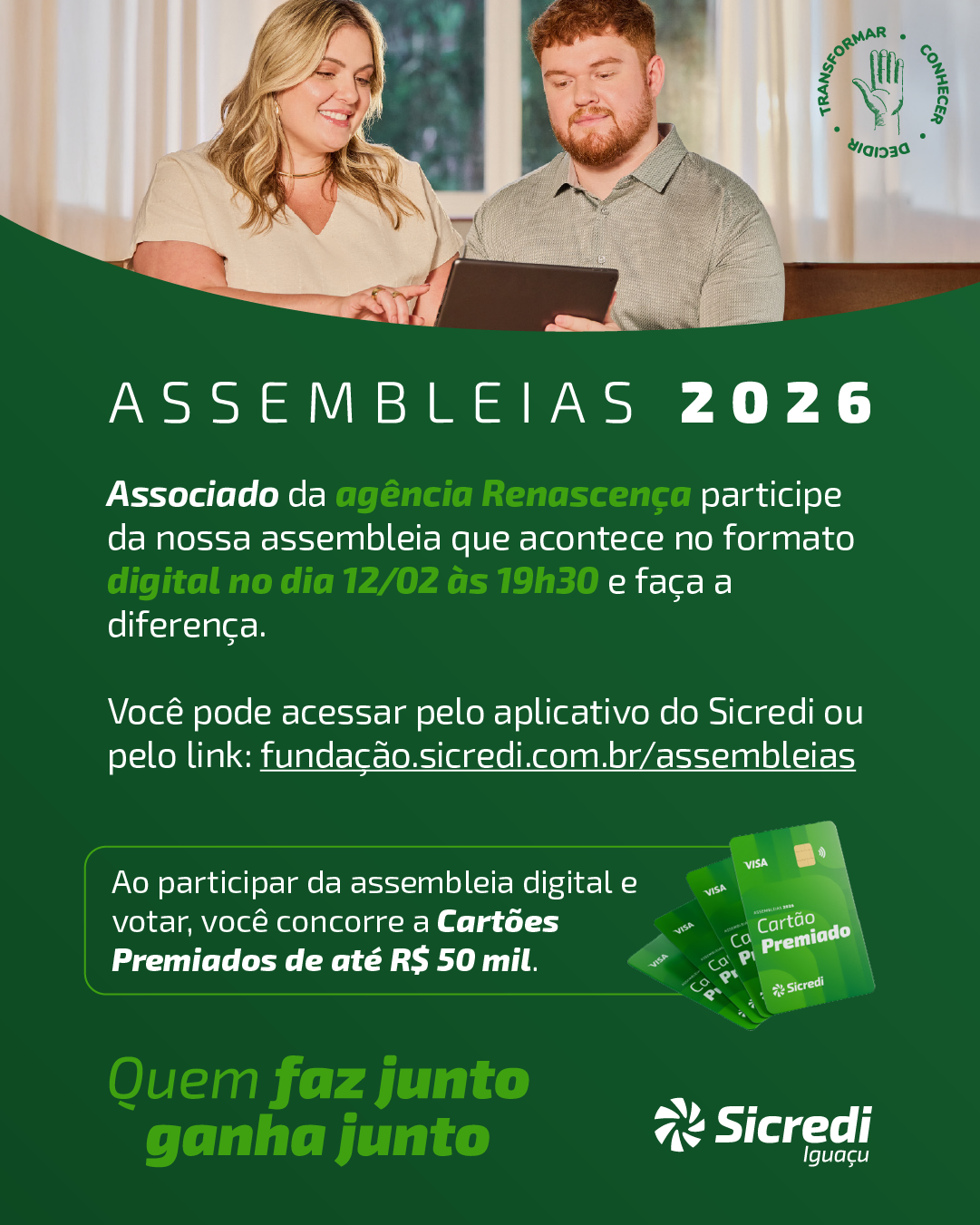 Associados da Cooperativa de Crédito Sicredi de Renascença, participem da nossa Assembleia Geral 2026, que neste ano será realizada no formato digital.