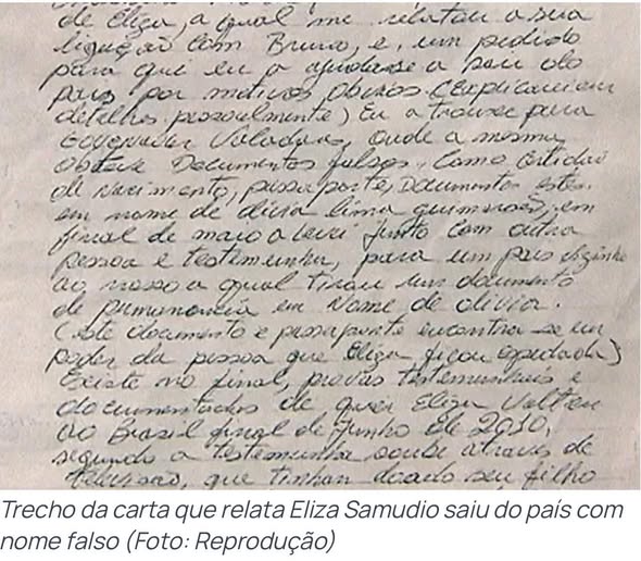 “De Eliza, a qual me relatou a sua ligação com Bruno, e um pedido para que eu a ajudasse a sair do país por motivos óbvios. Eu a esclareci pessoalmente e a trouxe, onde a mesma obteve documentos falsos, como certidão de nascimento, passaporte, documentos estes em nome de Dídia Lima Guimarães”, diz um trecho da carta.
