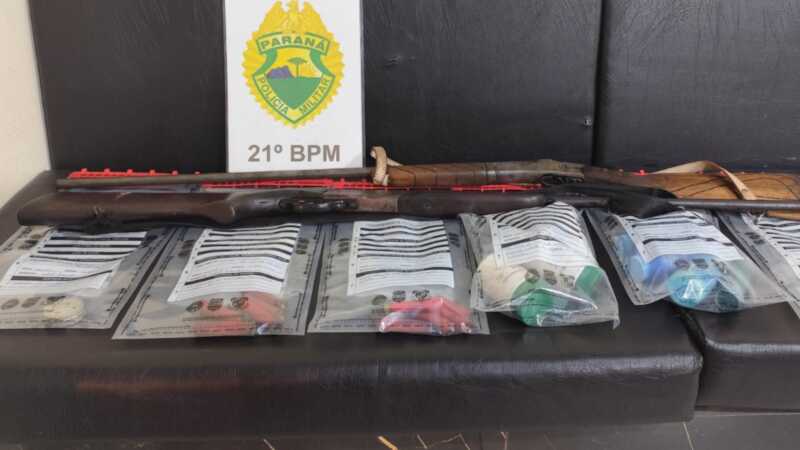 Na sequência, a equipe policial deslocou-se até a residência do casal, onde foi realizada a abordagem do indivíduo apontado como autor. Durante buscas no local, foram encontradas duas espingardas, calibres .32 e .36, além de munições e diversos materiais utilizados para a confecção artesanal de cartuchos, como pólvora, chumbo e espoletas.