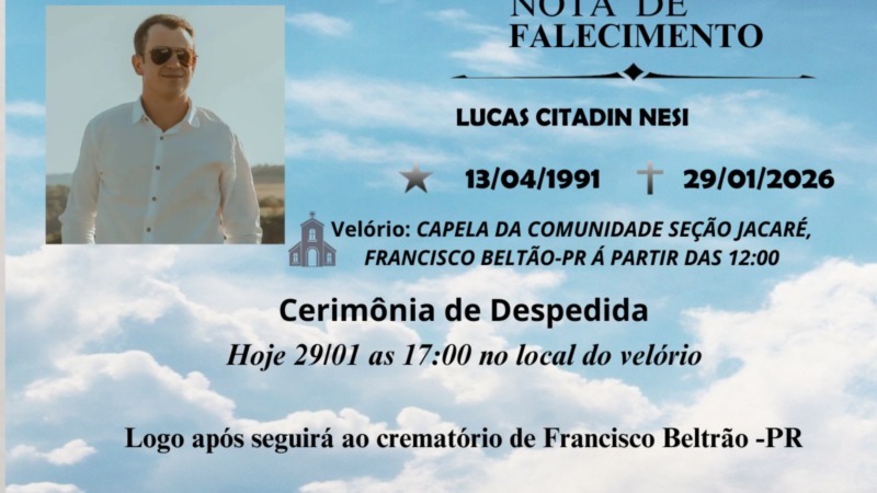 A Empresa Funerária Renascer, comunica com pesar, o falecimento de LUCAS CITADIN NESI, aos 34 anos, ocorrido nesta Quinta-Feira, 29 de Janeiro, em sua residência.