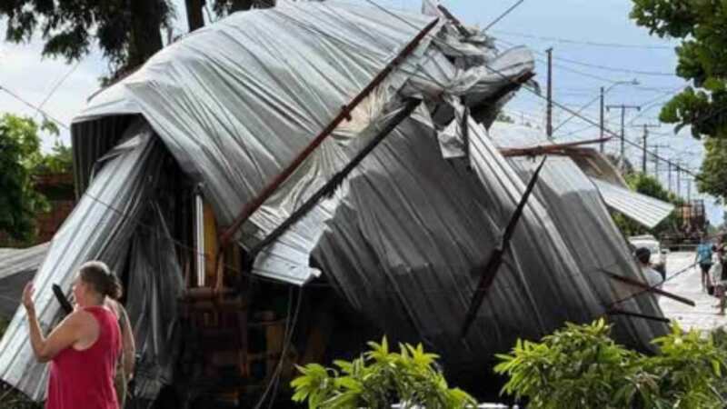Uma rajada de vento atingiu uma propriedade rural, arrancando a cobertura de um barracão, que acabou danificando a estrutura ao lado.