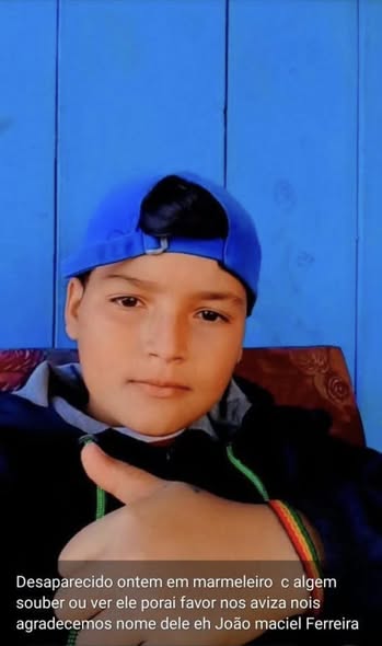 O adolescente João Maciel Ferreira, de 14 anos, está desaparecido desde ontem na cidade de Marmeleiro.