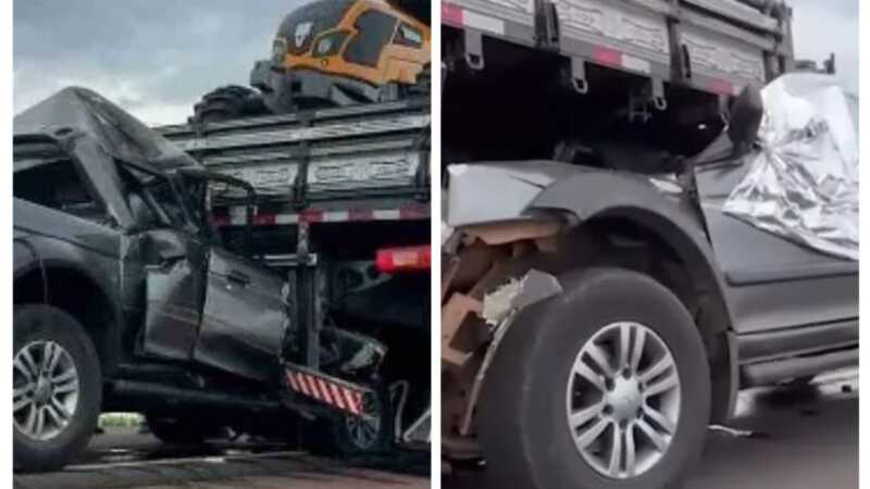 Com a força da colisão, a caminhonete Mitsubishi L200 ficou presa à traseira de um caminhão que transportava tratores, tendo a parte dianteira completamente destruída.