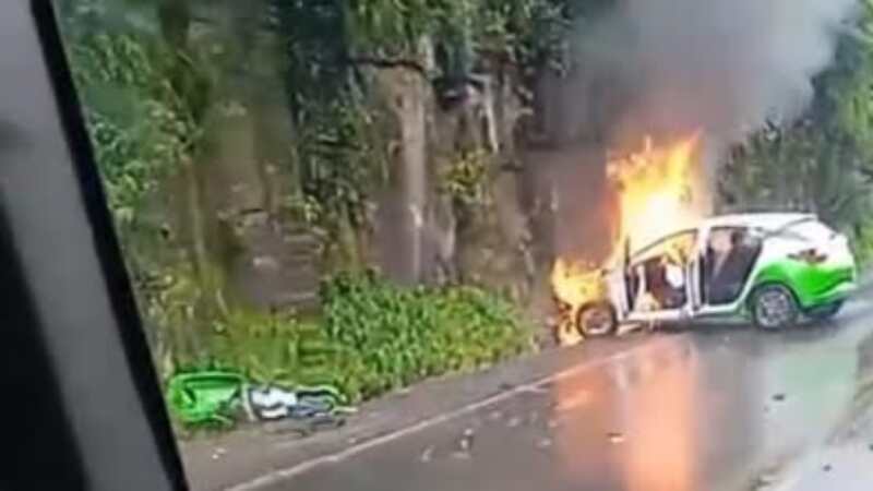 Carro da Prefeitura de Marmeleiro pega fogo após bater em barranco na BR-373; quatro pessoas ficam feridas