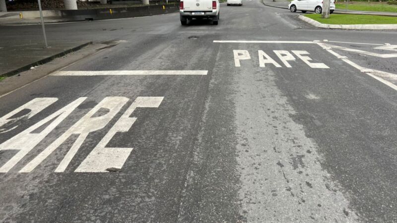 Erro de ortografia em pintura no asfalto chama atenção em Guaramirim