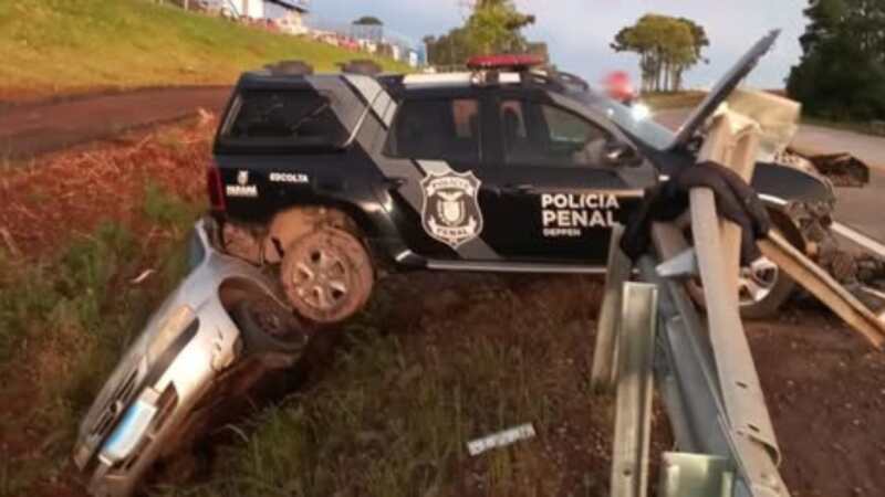 Viatura da Polícia Penal e automóvel colidem após aquaplanagem na PRC-280