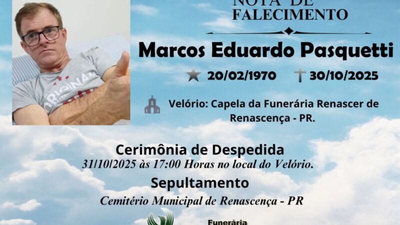 Funerária Renascer comunica, , o falecimento de Marcos Eduardo Pasquetti
